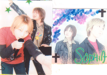 普通に買い物に出かけたハズなのに、 何故かそのままコスプリが撮れる俺等って・・・。 左はライヴ仕様です! 見にくいけど、よく見るとマイクと楽器が書いてあります(笑) 右は、アー写っぽくしよう!ってことだったんですが・・・。 かなり胡散臭いですね(苦笑) |