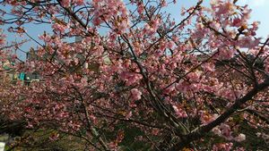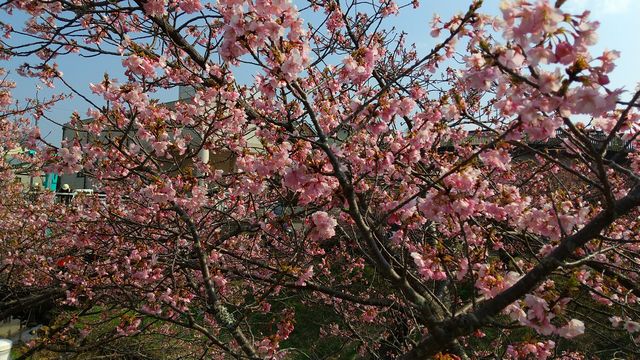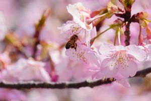 @加茂川の河津桜に蜂が飛んできました。刺激しないよう恐る恐るの撮影です。