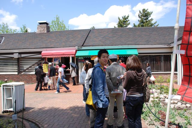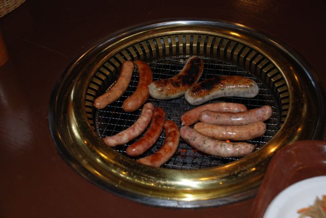 ↑中央の木の陰に見えるのが農場レストラン花車です。レストランの右にある傘のようなベンチでも食事をすること(+300円)ができます。 ↑混んでいて1時間近く待ちました。 ↑ソーセージバイキング(1500円 サラダバー付き90分)、火が使えるのが90分 ↑6種類のソーセージが選べます。 ↑ごはんは、白米と竹の子ご飯でした。季節によって変わるようです。